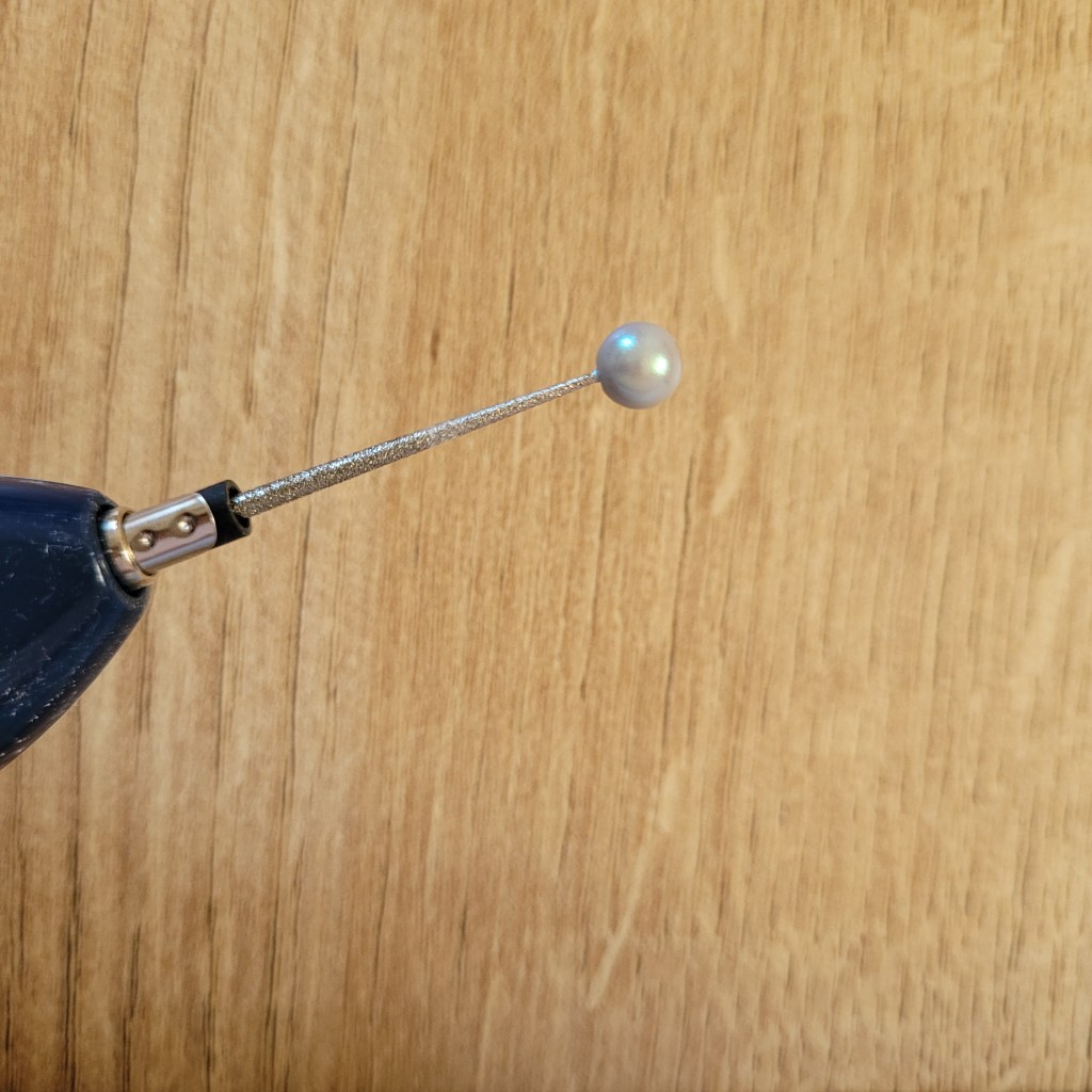 All of the beads coped well with my attempts to reduce their all-over surface area, though I wasn’t exactly going out of my way to mishandle them. The neon apatite bead was the most difficult, though. I barely got the reamer tip even halfway in from either side, even after trying for a few minutes. It also got a bit scuffed and marked because it was the first bead I tried the reamer out on, and wasn’t quite used to holding it and hadn’t quite put the right amount of light pressure on the On/Off button. I would say that – thankfully – it worked best on the synthetic pearl, filing away at the crystal interior far more easily and quickly than the other beads. I also had some success with the sodalite bead too. Now I think about it, it might be because they were the two most spherical beads, so it was easier to get a grip on them. I probably should’ve made sure the others were similar sizes and shapes too. So that’s a fault on my part.