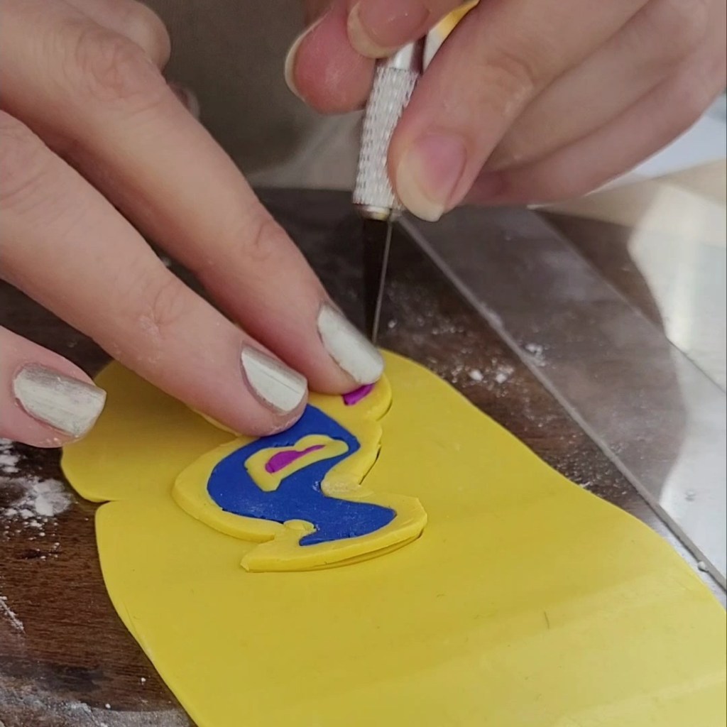 Using a stencil would certainly be the less time-consuming and simplest option – I’m imagining something similar to decorating a cake, which I enjoy doing (likely because I only do it once a year for my kid’s birthday) – but after watching so many polymer clay cane slicing videos online, I kind of want to try that.